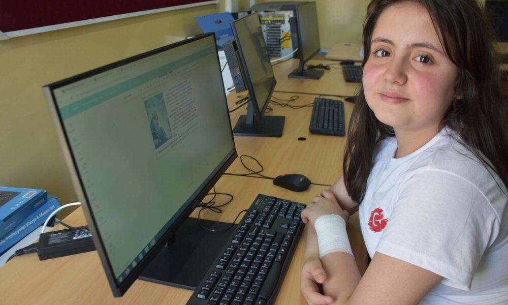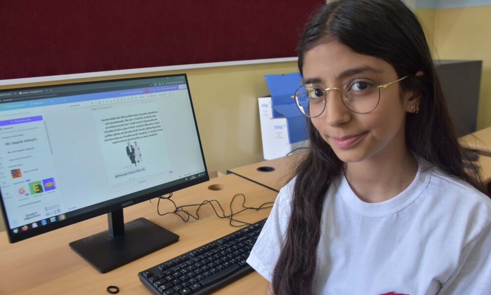İzmir Buca 30 Ağustos Ortaokulu 5'inci sınıf öğrencileri, İzmir ile ilgili hikayeler yazıp yapay zeka araçlarını kullanarak içeriklerini dijital formata dönüştürdü.Ayşenaz Çatın (Fotoğrafta).Fotoğraf:Nevra UÇKAÇ/İzmir,(DHA)