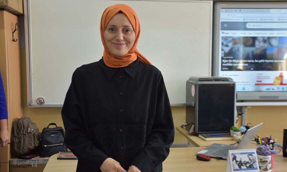 İzmir Buca 30 Ağustos Ortaokulu 5'inci sınıf öğrencileri, İzmir ile ilgili hikayeler yazıp yapay zeka araçlarını kullanarak içeriklerini dijital formata dönüştürdü.Fatma Kırcalı (Fotoğrafta).Fotoğraf:Nevra UÇKAÇ/İzmir,(DHA)