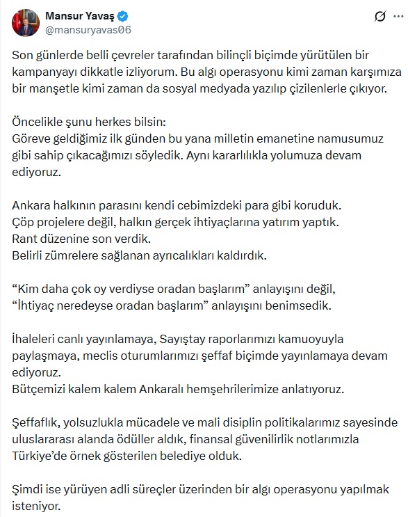 ABB Başkanı Mansur Yavaş, sanal medya hesabından yaptığı açıklamada, son günlerde belli çevreler tarafından kendisine yönelik bilinçli bir kampanya yürütüldüğünü belirterek, “Bu algı operasyonu kimi zaman karşımıza bir manşetle kimi zaman da sosyal medyada yazılıp çizilenlerle çıkıyor. Öncelikle şunu herkes bilsin, göreve geldiğimiz ilk günden bu yana milletin emanetine namusumuz gibi sahip çıkacağımızı söyledik. Aynı kararlılıkla yolumuza devam ediyoruz. Ankara halkının parasını kendi cebimizdeki para gibi koruduk. Çöp projelere değil, halkın gerçek ihtiyaçlarına yatırım yaptık. Rant düzenine son verdik. Belirli zümrelere sağlanan ayrıcalıkları kaldırdık. Kim daha çok oy verdiyse oradan başlarım anlayışını değil, İhtiyaç neredeyse oradan başlarım anlayışını benimsedik. İhaleleri canlı yayınlamaya, Sayıştay raporlarımızı kamuoyuyla paylaşmaya, meclis oturumlarımızı şeffaf biçimde yayınlamaya devam ediyoruz. Bütçemizi kalem kalem Ankaralı hemşehrilerimize anlatıyoruz. Şeffaflık, yolsuzlukla mücadele ve mali disiplin politikalarımız sayesinde uluslararası alanda ödüller aldık, finansal güvenilirlik notlarımızla Türkiye’de örnek gösterilen belediye olduk” dedi.