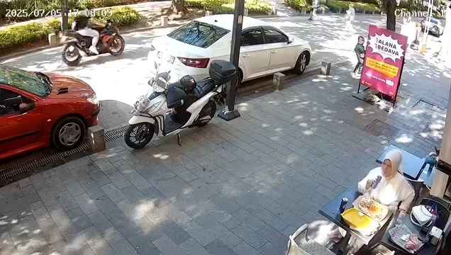 Kaza anı güvenlik kamerası tarafından kaydedildi. Görüntüde; motosikletlinin yaya geçinde kadına çarpmasının ardından savrularak devrildiği görüldü. Kadın yaralanırken, motosikletten düşen sürücü ise hafif sıyrıklarla kazayı atlattı. Kazanın ardından çevredeki vatandaşların, ikilinin yardımına koştuğu anlar görüntüye yansıdı.