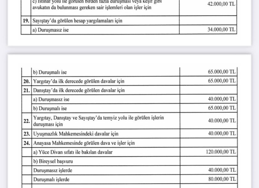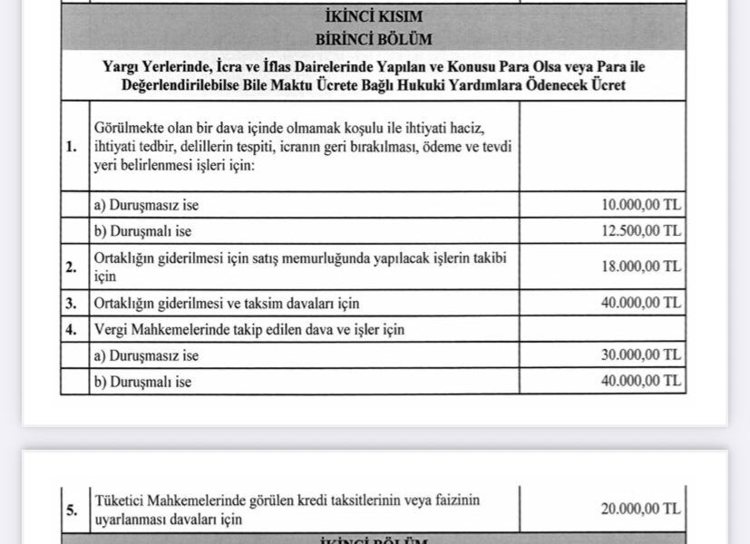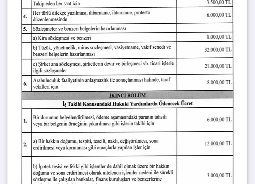 Resmi Gazetede yayımlanarak yürürlüğe giren yeni Avukatlık Asgari Ücret Tarifesine göre; kamu kurum ve kuruluşlarıyla özel ve tüzel kişilerin sözleşmeli avukatlarına ödeyecekleri ücret en az 33 bin TL, dava ücretleri ise 9 bin TL ile 120 bin TL arasında olacak. Avukatla büroda sözlü danışma ücreti ilk 1 saat için 4 bin TL, sonraki her 1 saat için bin 800 TL olarak belirlenirken, çağrı üzerine gidilen yerde 1 saate kadar sözlü danışma ücreti ise 7 bin TL oldu.