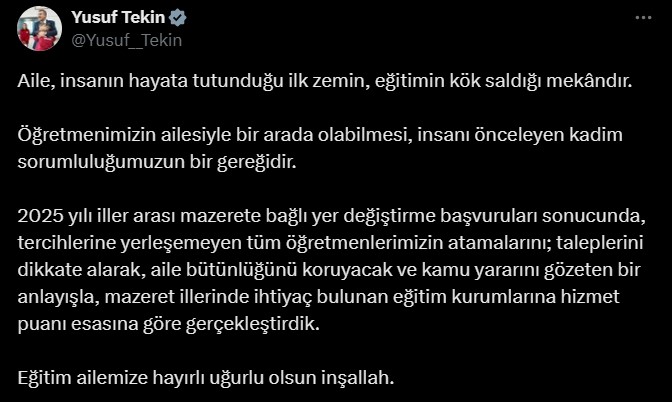 Milli Eğitim Bakanı Yusuf Tekin, sosyal medya hesabından yaptığı açıklamada, “Aile, insanın hayata tutunduğu ilk zemin, eğitimin kök saldığı mekandır. Öğretmenimizin ailesiyle bir arada olabilmesi, insanı önceleyen kadim sorumluluğumuzun bir gereğidir. 2025 yılı iller arası mazerete bağlı yer değiştirme başvuruları sonucunda, tercihlerine yerleşemeyen tüm öğretmenlerimizin atamalarını; taleplerini dikkate alarak, aile bütünlüğünü koruyacak ve kamu yararını gözeten bir anlayışla, mazeret illerinde ihtiyaç bulunan eğitim kurumlarına hizmet puanı esasına göre gerçekleştirdik. Eğitim ailemize hayırlı uğurlu olsun inşallah” dedi.