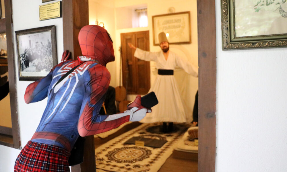 İzmirde yaşayan Ayaz Salih Koç, 6 Şubat depremlerinin ardından gönüllü olarak bölgeye gitti. Yanında götürdüğü örümcek adam kostümüyle çocukları eğlendiren Ayaz Salih Koç, bölgedeki depremzedelere yönelik yardım faaliyetlerinde görev aldı. Deprem bölgesinde yaşadığı olay sonrası giydiği pijama nedeniyle yerli pijamalı örümcek adam olarak anılmaya başlayan Koç, bölgeden ayrıldıktan sonra da Türkiyeyi dolaşmaya karar verdi. Otostopla 1 yılı aşkın süredir Türkiyeyi dolaşan ve gittiği yerleri sosyal medyada paylaşımlar yaparak tanıtmaya çalışan Ayaz Salih Koç, bugüne kadar 46 ili dolaştı. 47nci şehir olarak Afyonkarahisara gelen Koç, Ulu Camii çevresindeki tarihi konakları, Türbe Camii bahçesinde yer alan Mevlevihane Müzesini gezdi. Müze Müdürü Hasan Özpınar, Mevlevihane hakkında Koça bilgi verdi. Koç da Özpınara kendisini ve hayallerini anlattı.