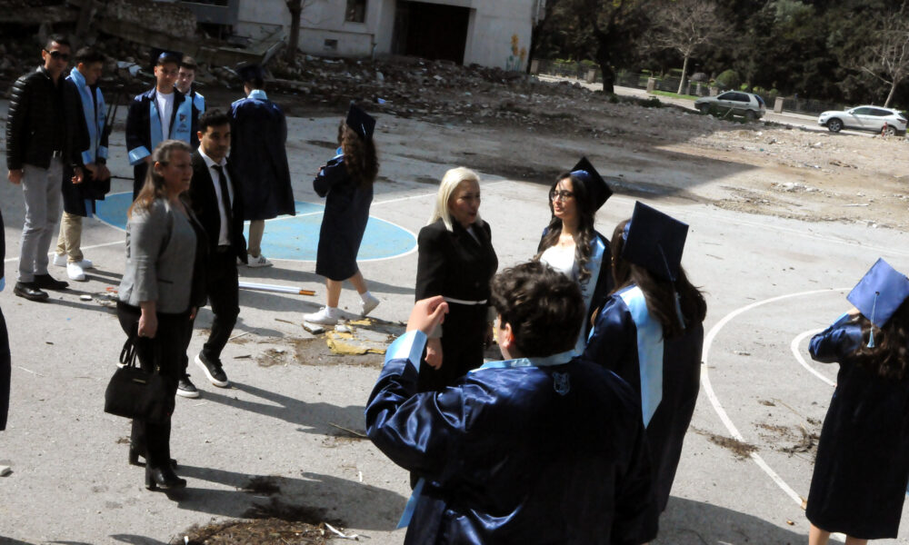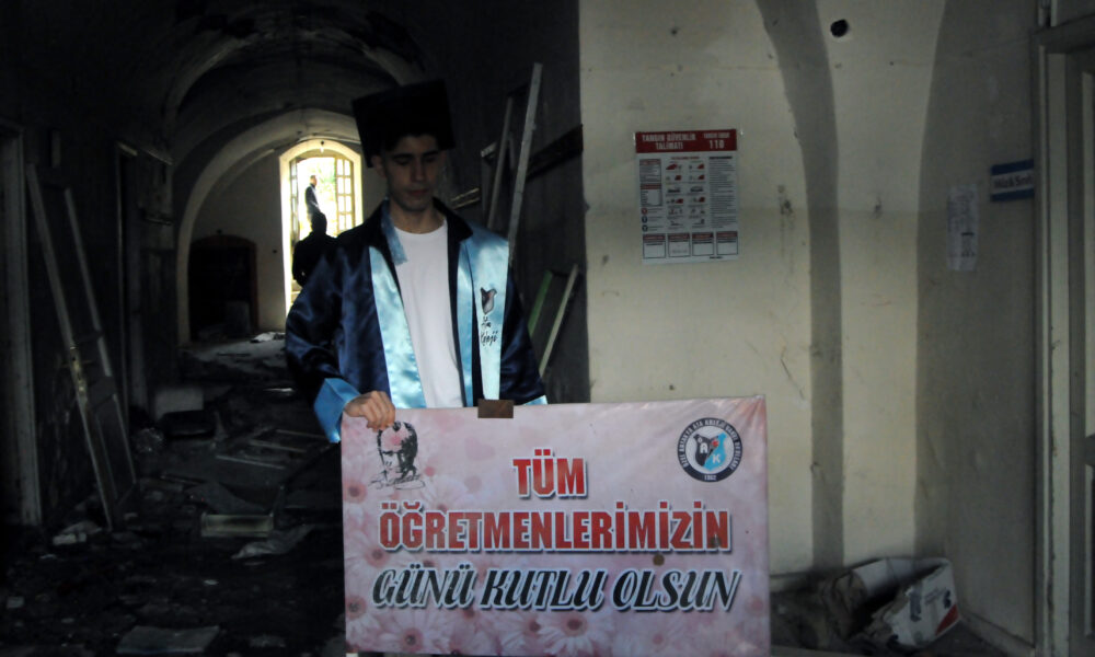 Yıkılmış okulda hüzünlü mezuniyet hatırası