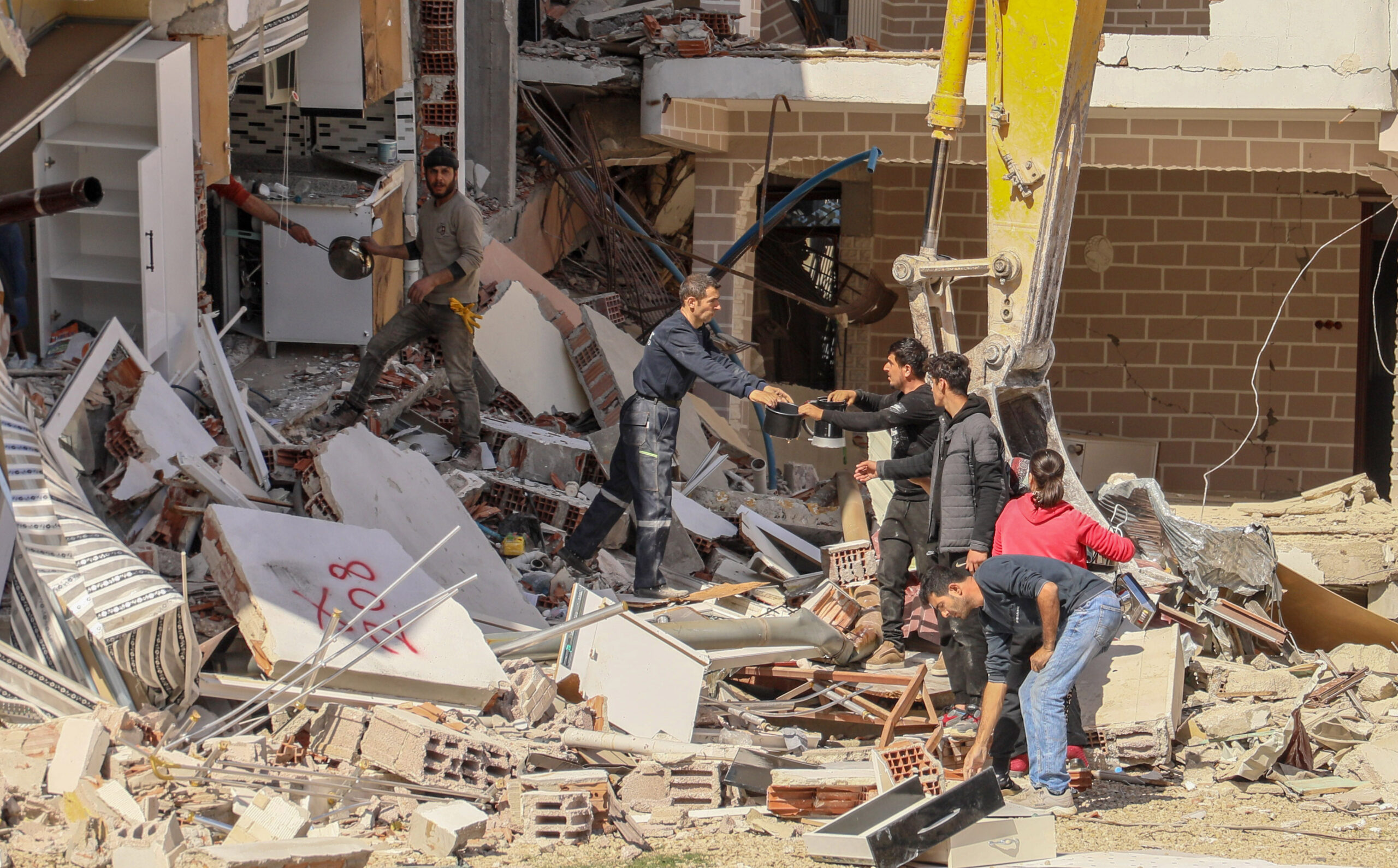 HATAY’ın Samandağ ilçesinde depremde hasar gören evin yıkımı sırasında içeri giren ev sahipleri, tehlikeye aldırış etmeden eşyaları elden ele vererek dışarı çıkardı.