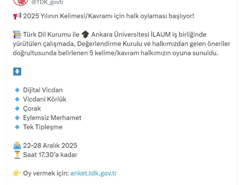 TDKden yapılan açıklamaya göre, geçen ay Ankara Üniversitesi İletişim Araştırmaları ve Uygulama Merkezi (İLAUM) iş birliğiyle 2025 Yılının Kelimesi/Kavramını belirlemek için öneri süreci başlatıldı. Bu kapsamda, Değerlendirme Kurulu ve halktan gelen önerilerin değerlendirilmesiyle belirlenen 5 kelime/kavram halkın oylamasına açıldı. Bu kelime/kavramlar dijital vicdan, vicdani körlük, çorak, eylemsiz merhamet ve tek tipleşme oldu. 22 Aralıkta başlayan oylama süreci 28 Aralık 2025te saat 17.30da sona erecek. Oylamaya katılmak isteyenler, Türk Dil Kurumunun genel ağ sayfasında yer alan https://anket.tdk.gov.tr/ bağlantı üzerinden oy kullanabilecek.