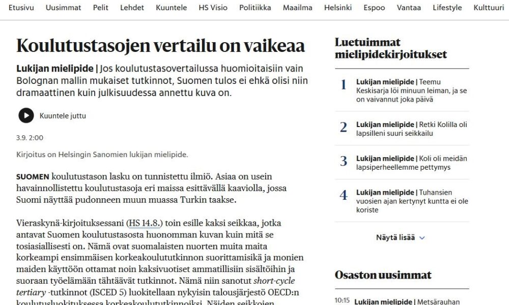 YÖKten yapılan yazılı açıklamaya göre; Finlandiyanın önde gelen gazetelerinden Helsingin Sanomatta, Jukka Eero Wuorinen imzalı yazıda, Türkiyenin yükseköğretimde son yıllarda attığı stratejik adımların meyvelerini aldığı vurgulandı. Türk yükseköğretiminin bazı önemli konularda Finlandiyanın önüne geçtiğine dikkat çekilen yazıda, Türkiyenin yükselişinin temel nedenleri arasında; Türkiyede son 20 yılda üniversite sayısının ve kontenjanların artmasıyla yükseköğretime erişimin kolaylaşması, Türk öğrencilerin, Avrupadaki pek çok akranına kıyasla daha erken yaşta mezun olarak iş gücüne daha hızlı katılması ve Mesleki programları çeşitlendirerek esnek eğitim fırsatlarına sahip olması gösterildi. Yazıda, “Finlandiyada eğitim seviyesinin düşüşe geçtiği kabul edilen bir olgudur. Ülkelerin eğitim seviyelerini gösteren grafiklerde Finlandiyanın, örneğin Türkiyenin gerisine düştüğü görülmektedir” ifadeleri kullanıldı.