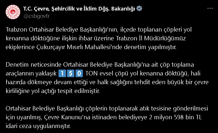 Bakanlığın sosyal medya hesabından yapılan açıklamada, “Denetim neticesinde Ortahisar Belediye Başkanlığına ait çöp toplama araçlarının yaklaşık 150 ton evsel çöpü yol kenarına döktüğü, hali hazırda dökmeye devam ettiği ve halk sağlığını tehdit eden büyük bir çevre kirliliğine yol açtığı tespit edilmiştir. Ortahisar Belediye Başkanlığı çöplerin toplanarak atık tesisine gönderilmesi için uyarılmış, Çevre Kanunu’na istinaden belediyeye 2 milyon 598 bin TL idari ceza uygulanmıştır. Bakanlığımız çevreyi kirleterek toplum sağlığını tehdit eden hiçbir uygulamaya izin vermeyecektir” denildi.