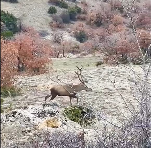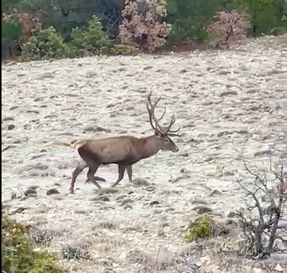 Ormanlık alandan geçen kara yolunda seyahat eden bir vatandaş, Türkiyede yaşayan geyik türleri arasında en büyüğü olan kızılgeyikleri dolaşırken fark etti. Aracından inen vatandaş, sürü halinde gezen kızıl geyikleri cep telefonuyla görüntüledi. Bir süre yol kenarındaki arazide ilerleyen geyikler, ormana doğru giderek gözden kayboldu.