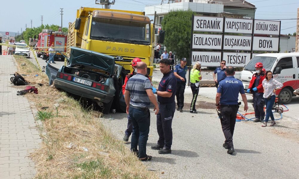 Kaza, saat 12.30 sıralarında Çanakkale-İzmir kara yolunun Hürriyet Mahallesinde meydana geldi. İddiaya göre, yola çıkan köpeği fark eden Hasan Özkayanın (22) ani manevra yaptığı 10 F 0501 plakalı otomobil kaldırımı aşarak yan yolda seyir halinde ilerleyen V.B. yönetimindeki 10 AEK 163 plakalı hafriyat kamyonu ile çarpıştı. Ön kısmı hafriyat kamyonunun altına giren otomobil hurdaya dönerken, ihbar üzerine olay yerine ekipler sevk edildi. Sağlık ekipleri yaptıkları kontrolde otomobil sürücü Özkaya ile yanındaki Ali Yıldız (20) ve Nazife Nehir Akyayın (22) hayatını kaybettiğini belirledi. Kazada ağır yaralanan Fatma Sıla Ecerel (18) ise ilk müdahalesinin ardından ambulansla Burhaniye Devlet Hastanesine kaldırıldı. Ecerelin sağlık durumunun ciddiyetini koruduğu öğrenilirken, çevredekiler kazaya neden olan köpeğin yara almadığını belirtti.