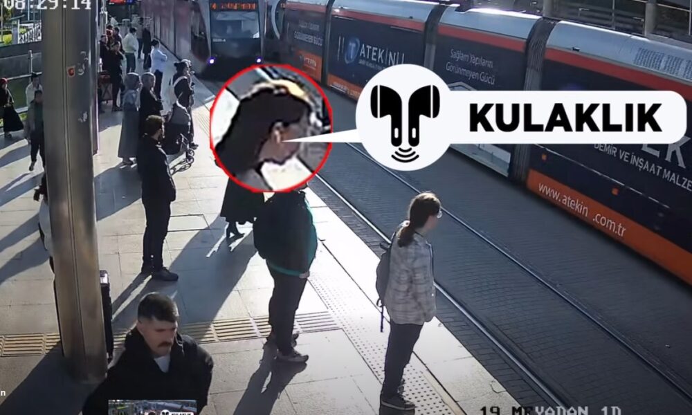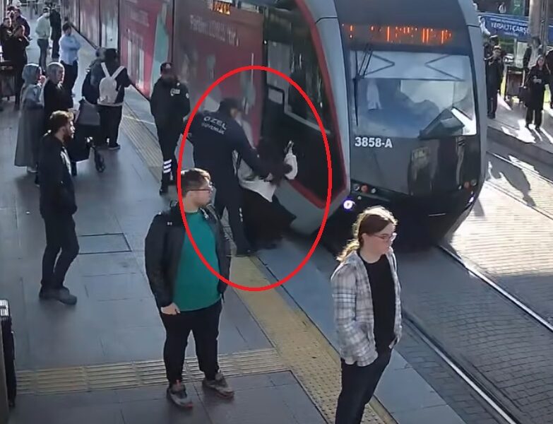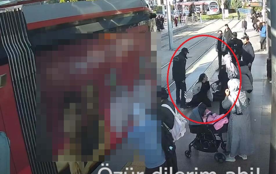 Olay, dün saat 08.30 sıralarında Cumhuriyet Meydanı tramvay durağında meydana geldi. Kulağında kulaklık, yolun karşısına geçmeye çalışan kadın yolcuyu bu sırada durağa yanaşan tramvayın altında kalmaktan güvenlik görevlisi kurtardı. O anlar güvenlik kamerasına yansıdı. Görüntülerde, yayanın kendisini kurtaran güvenlik görevlisinden özür dilediği duyuldu.
