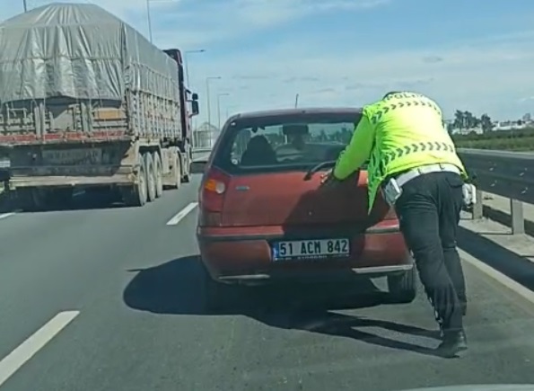 Yolda kalan sürücünün imdadına trafik polisi yetişti
