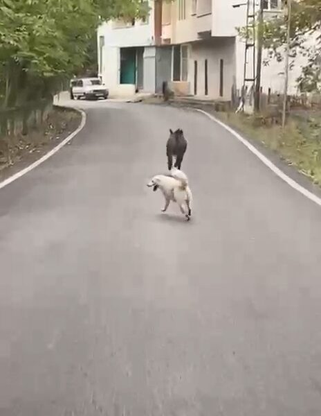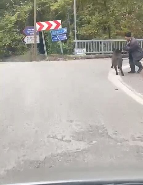 Olay, öğle saatlerinde Devrek ilçesine bağlı Yağmurca köyünde meydana geldi. Yol kenarında yürüyen kişi, gelen sesleri duyup arkaya dönerek baktığında, köpekten kaçan bir domuzun üzerine doğru geldiğini fark etti. Bu kişi ani bir refleksle domuzdan kurtulurken, hayvan ise yoldan koşarak uzaklaştı. O anları bir sürücü, cep telefonuyla kayda aldı.