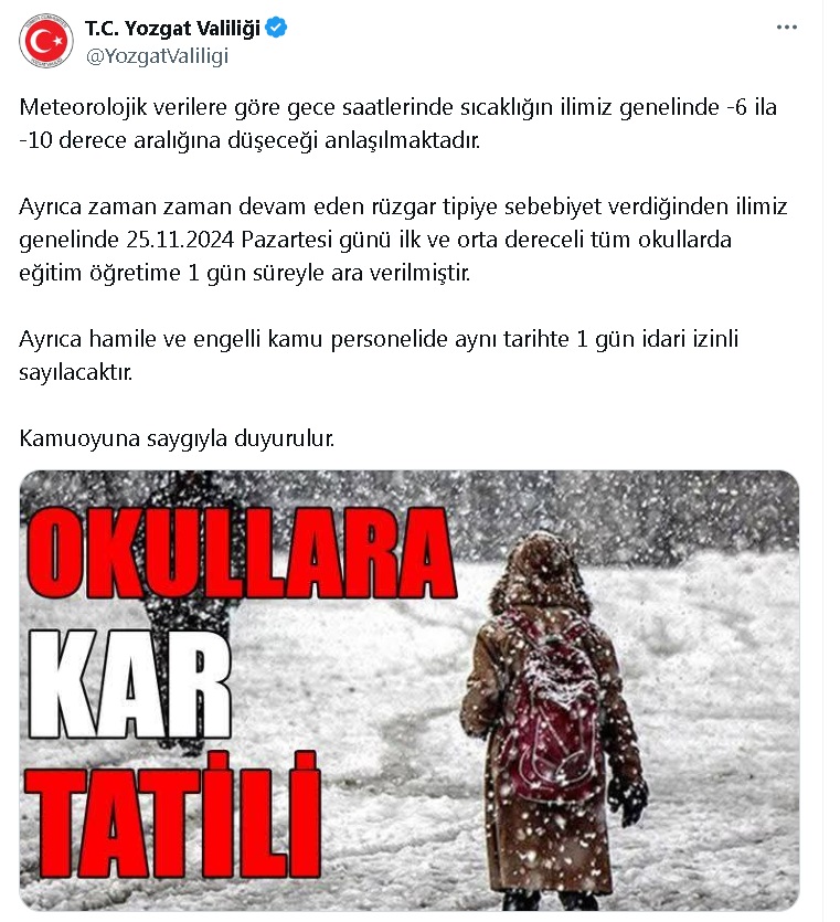 Valiliğin sosyal medya hesabından yapılan açıklamada, “Meteorolojik verilere göre gece saatlerinde sıcaklığın ilimiz genelinde -6 ila -10 derece aralığına düşeceği anlaşılmaktadır. Ayrıca zaman zaman devam eden rüzgar tipiye sebebiyet verdiğinden ilimiz genelinde 25 Kasım 2024 Pazartesi günü ilk ve orta dereceli tüm okullarda eğitim öğretime 1 gün süreyle ara verilmiştir. Ayrıca hamile ve engelli kamu personeli de aynı tarihte 1 gün idari izinli sayılacaktır” denildi.