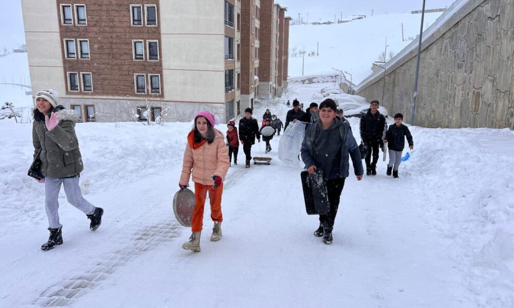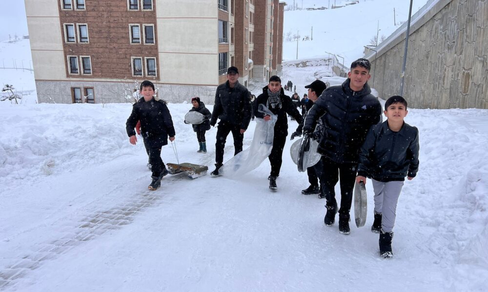 Yüksekova’da çocukların kar keyfi; tepsilerle kayak yaptılar