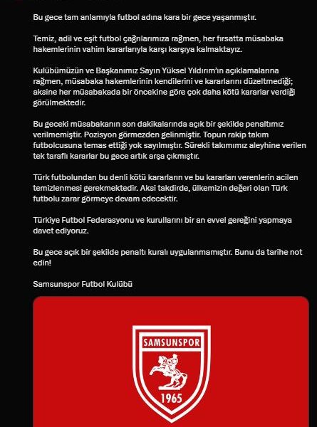 Samsunspor sosyal medya hesaplarından yapılan açıklamada ise, “Bu gece tam anlamıyla futbol adına kara bir gece yaşanmıştır. Temiz, adil ve eşit futbol çağrılarımıza rağmen, her fırsatta müsabaka hakemlerinin vahim kararlarıyla karşı karşıya kalmaktayız. Kulübümüzün ve Başkanımız Sayın Yüksel Yıldırım’ın açıklamalarına rağmen, müsabaka hakemlerinin kendilerini ve kararlarını düzeltmediği; aksine her müsabakada bir öncekine göre çok daha kötü kararlar verdiği görülmektedir. Bu geceki müsabakanın son dakikalarında açık bir şekilde penaltımız verilmemiştir. Pozisyon görmezden gelinmiştir. Topun rakip takım futbolcusuna temas ettiği yok sayılmıştır. Sürekli takımımız aleyhine verilen tek taraflı kararlar bu gece artık arşa çıkmıştır. Türk futbolundan bu denli kötü kararların ve bu kararları verenlerin acilen temizlenmesi gerekmektedir. Aksi takdirde, ülkemizin değeri olan Türk futbolu zarar görmeye devam edecektir. Türkiye Futbol Federasyonu ve kurullarını bir an evvel gereğini yapmaya davet ediyoruz. Bu gece açık bir şekilde penaltı kuralı uygulanmamıştır. Bunu da tarihe not edin” ifadelerine yer verildi.