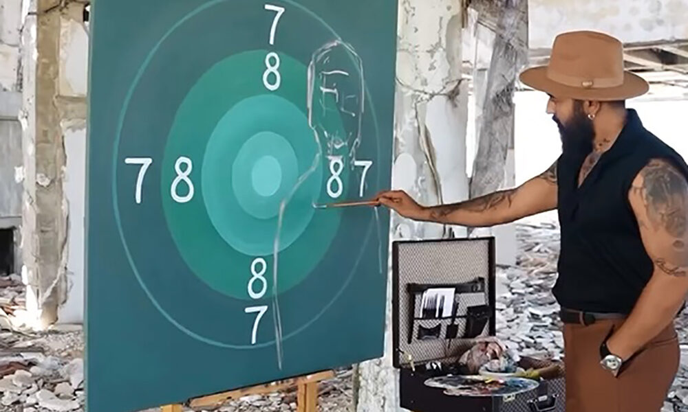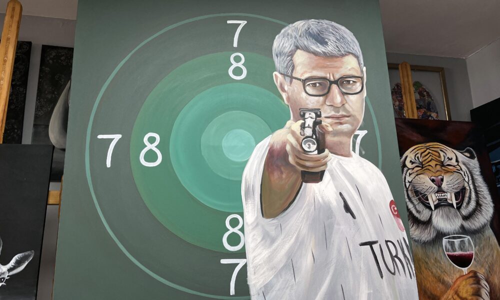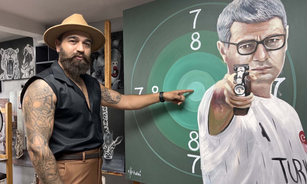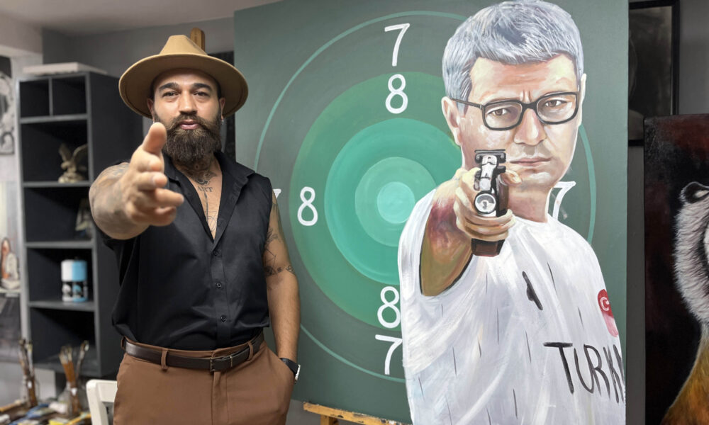 • Edirne'de ressam Hatai Abdullayev'in (fotoğrafta), Paris'te yapılan 2024 olimpiyatlarına damgasını vuran Yusuf Dikeç'i resmedip, hedef tahtasını boş bıraktığı tablo; milli atıcının canlı yayında yapacağı atışın ardından açık arttırmayla satılarak, geliri