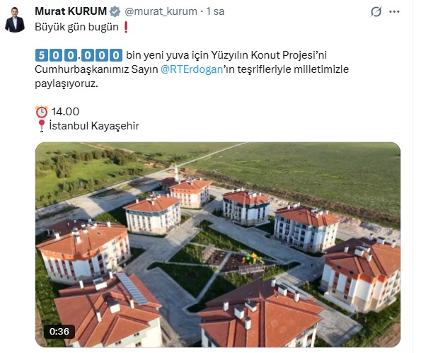 Çevre, Şehircilik ve İklim Değişikliği Bakanı Murat Kurum, projeye ilişkin sosyal medya hesabından yaptığı paylaşımda, “Büyük gün bugün. 500 bin yeni yuva için Yüzyılın Konut Projesini Cumhurbaşkanımız Recep Tayyip Erdoğanın teşrifleriyle milletimizle paylaşıyoruz” dedi.