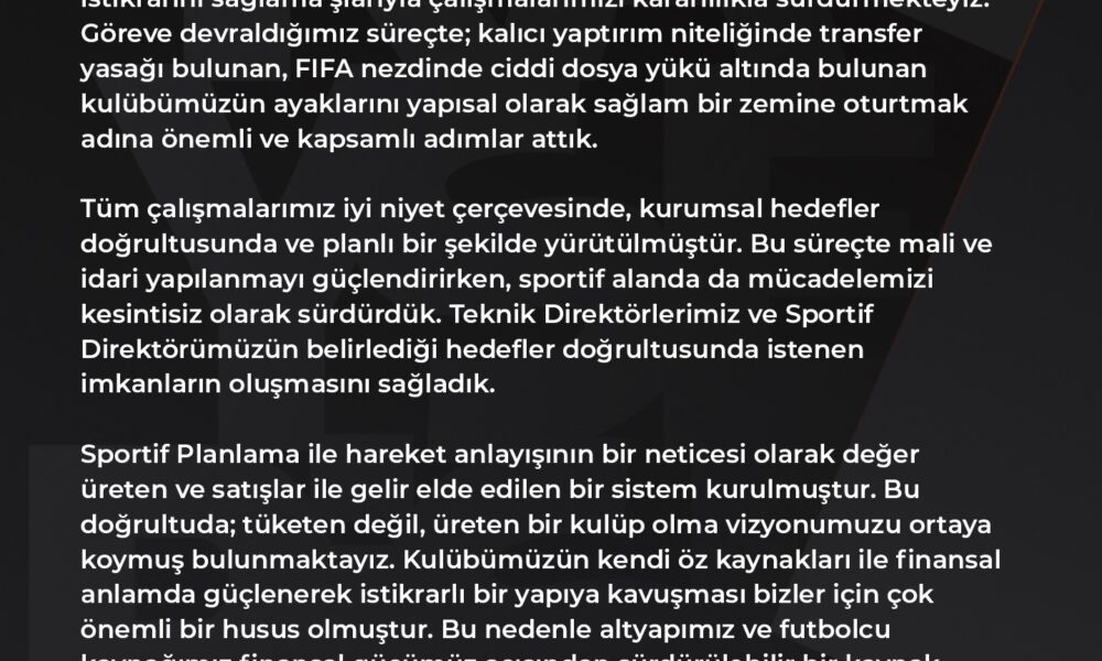 Sportif planlama ile hareket anlayışının bir neticesi olarak değer üreten ve satışlar ile gelir elde edilen bir sistem kurulduğuna da dikkat çekilen açıklamada şu ifadeler yer aldı: