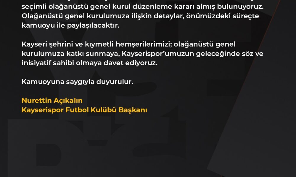 “Bu doğrultuda; tüketen değil, üreten bir kulüp olma vizyonumuzu ortaya koymuş bulunmaktayız. Kulübümüzün kendi öz kaynakları ile finansal anlamda güçlenerek istikrarlı bir yapıya kavuşması bizler için çok önemli bir husus olmuştur. Bu nedenle altyapımız ve futbolcu kaynağımız finansal gücümüz açısından sürdürülebilir bir kaynak olarak değerlendirilmiştir. Tüm bu faaliyetler, idari bir planlama çerçevesinde ve kurumsal bir anlayışla yürütülmüştür. Yönetim olarak temel inancımız; başarının da başarısızlığın da şahıslara değil, kulübün tüm paydaşlarına ait olduğudur. Bu anlayış doğrultusunda; şehrimizin ortak aklını devreye sokmak, kulübümüze yeni bir heyecan ve taze bir kan kazandırmak amacıyla seçimli olağanüstü genel kurul düzenleme kararı almış bulunuyoruz. Olağanüstü genel kurulumuza ilişkin detaylar, önümüzdeki süreçte kamuoyu ile paylaşılacaktır. Kayseri şehrini ve kıymetli hemşerilerimizi; olağanüstü genel kurulumuza katkı sunmaya, Kayserisporumuzun geleceğinde söz ve inisiyatif sahibi olmaya davet ediyoruz. Kamuoyuna saygıyla duyurulur.”