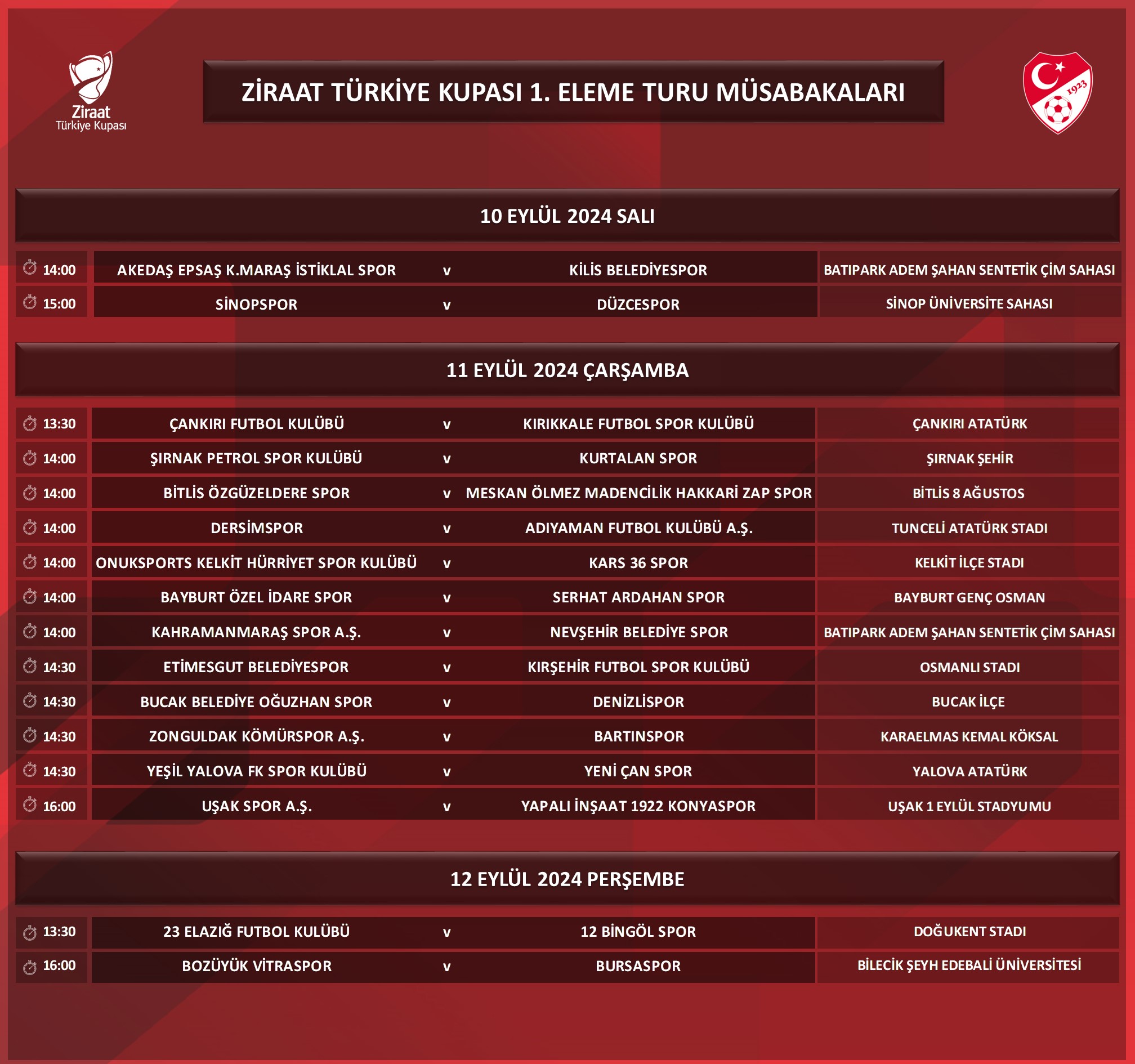 Türkiye Futbol Federasyonundan (TFF) yapılan açıklamaya göre 1inci Tur maç programı şu şekilde: