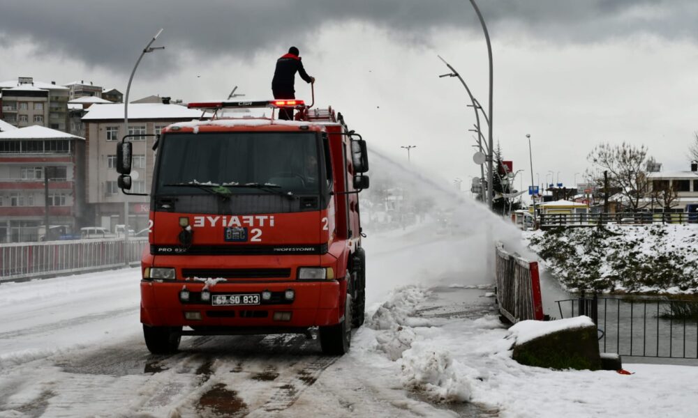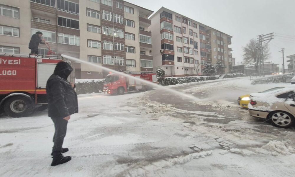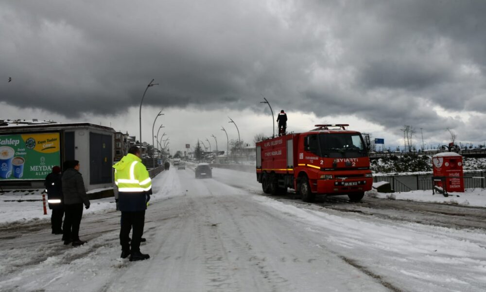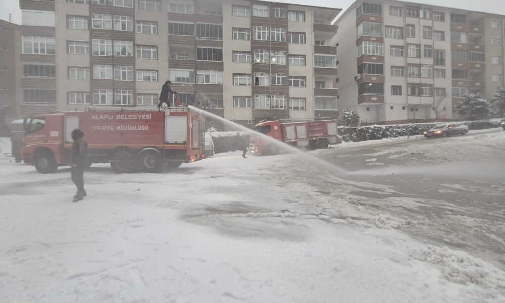 Zonguldak genelinde yeni yılın ilk saatlerinde etkisini arttıran kar yağışı, aralıklarla devam etti. Kent merkezinde çatılar ve araçların üstü beyaza bürünürken, kent güne kar ile başladı. Alaplı ilçesinde de kar etkili olurken bazı araçlar ilerlemekte güçlük çekti. Alaplı Belediyesi İtfaiyesi ekipleri, deniz suyu ile yollarda yıkama çalışması yaptı. İtfaiye Müdürü Sinan Taşkın, monitör isimli itfaiye aracının üstüne çıkarak buzlanan yokuşa su püskürttü. Kar ve buzun erimesiyle araçlar yollarına devam edebildi.