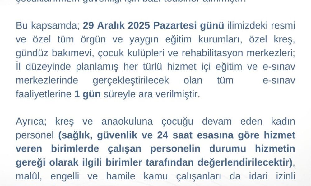 Meteorolojik tahminlere göre, 3 gündür olumsuz hava koşullarının hakim olduğu kentte yarın sabah da kar, yağmur ve fırtınanın devam edeceği belirtildi. Zonguldak Valisi Osman Hacıbektaşoğlu, güvenlik tedbirlerinin alındığını belirterek, yarın okulların 1 gün süreyle tatil edildiğini tüm hizmet içi eğitim ve e-sınav faaliyetlerine 1 günlük ara verildiğini duyurdu. Kreş ve anaokuluna giden çocuğu olan kadın personel ile malul, engelli ve hamile kamu çalışanlarının da idari izinli sayılacağı belirtildi.