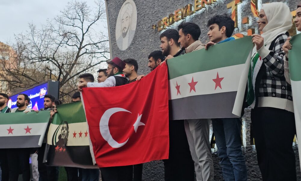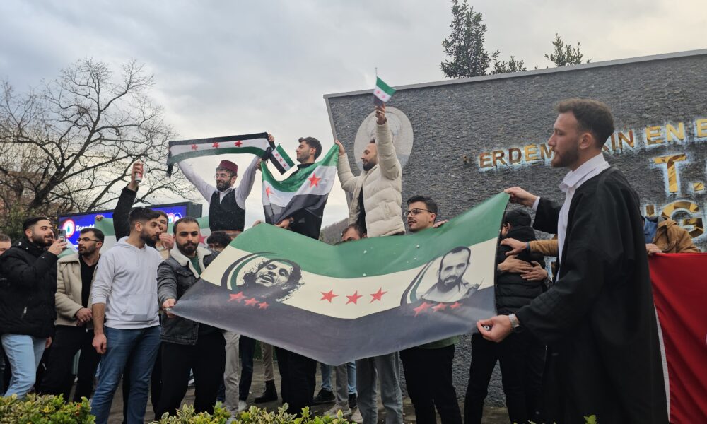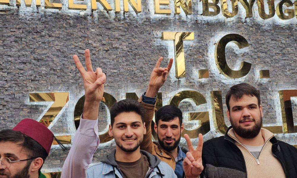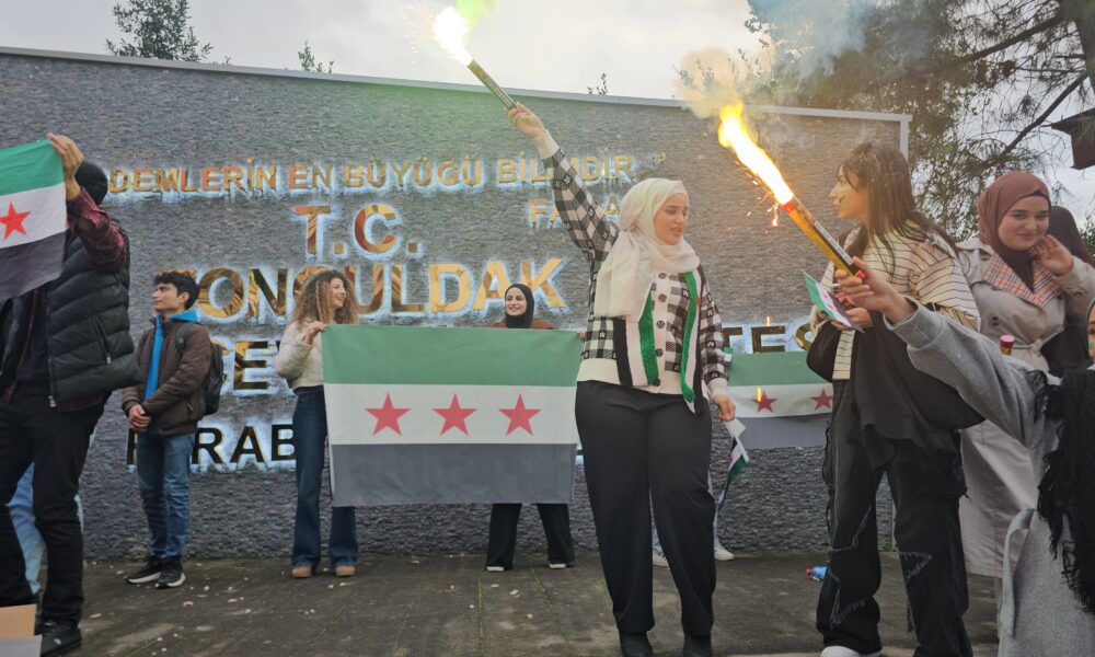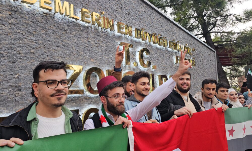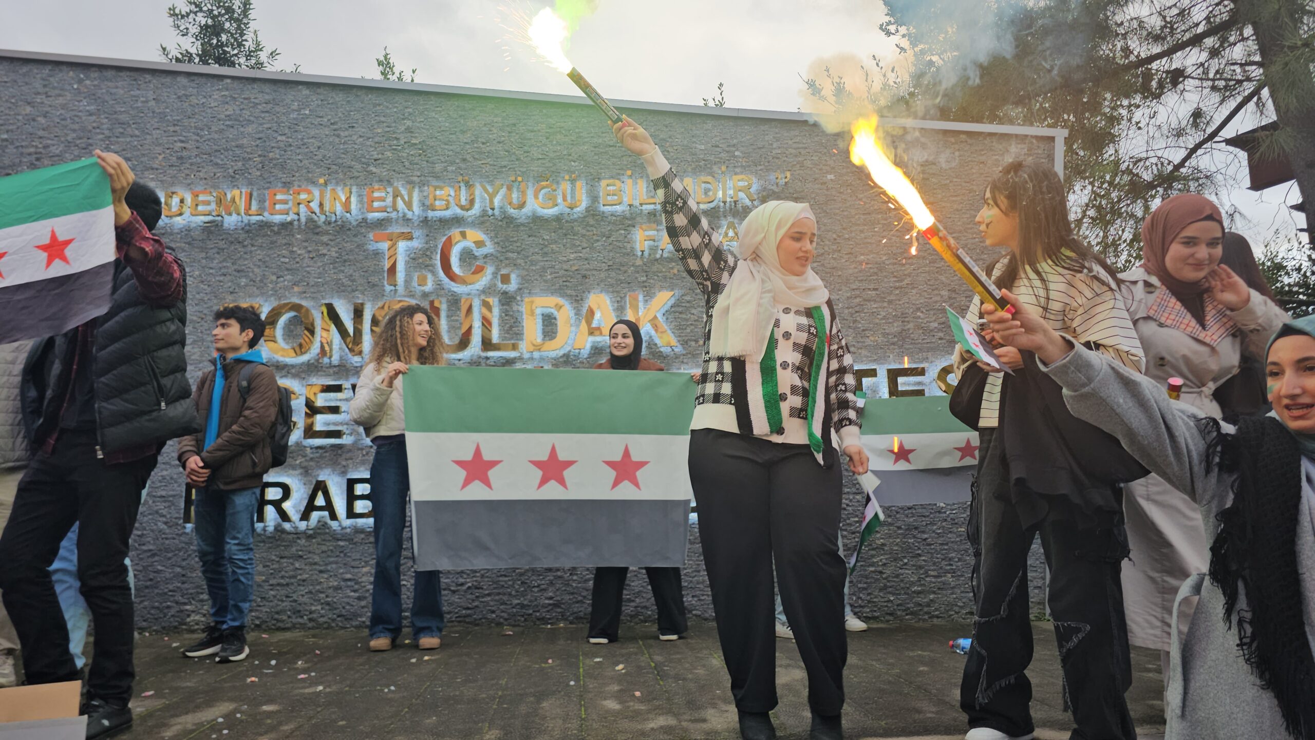 Zonguldak Bülent Ecevit Üniversitesi’nde eğitim gören Suriye uyruklu öğrenciler, ülkelerinde muhaliflerin kazandığı zaferi kutlamak için Rektörlük binası yanında toplandı. Öğrenciler, Yeni Suriye Bayrağı ve mücadelenin önemli isimlerinin yer aldığı pankart açarak çevredekilere tatlı ikram etti. Kutlama boyunca Arapça slogan atıp şarkılar söyleyen gruba kadınlar zılgıt çekerek destek verdi. Gösteri yapan grup zafer işaretinin yanında bozkurt işaretinin yaptı ve ve ‘Dombra’ şarkısının ‘Recep Tayyip Erdoğan’ versiyonu çalındı. Yaklaşık 1 buçuk saat süren kutlama boyunca havaya şeker atılırken Suriye’ye özgü acı kahve de ikram edildi.